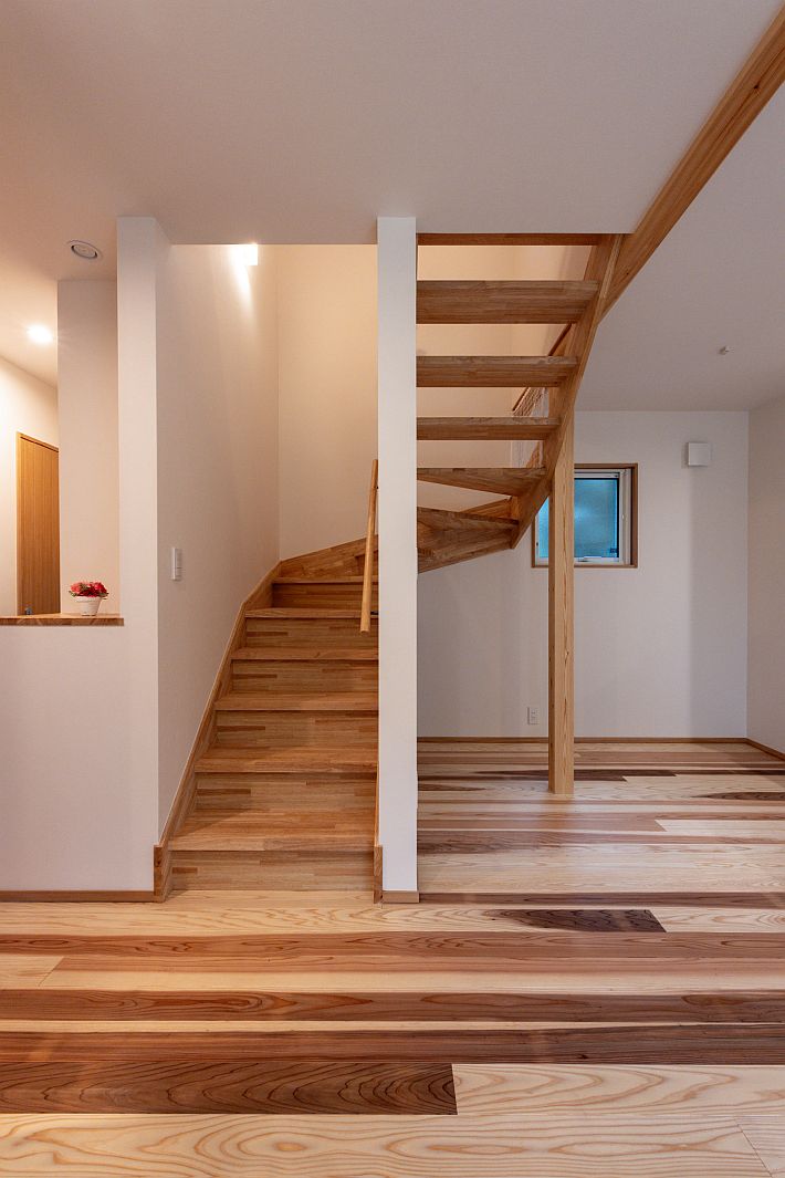 2階に上がる少し艶めかしい形状の半スケルトン階段。