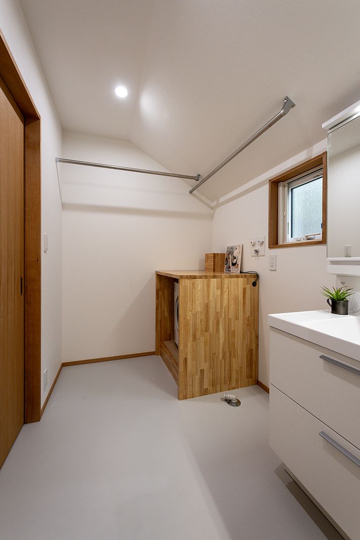 2階の洗面室。奥にある大きな正方形の箱はガス乾燥機「乾太くん」を収納するための箱であり、ちょっとした家事を行うためのカウンターでもあります。
