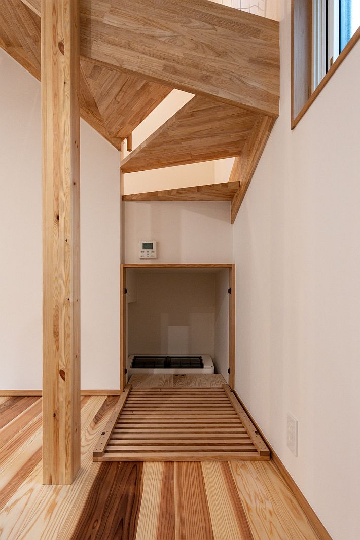 階段下のルーバーを手前に開くと、床下エアコンをメンテナンスすることができます。床下エアコン用のエアコンではなく、一般的な居室用のエアコンを利用しています。床暖房と違って床下全体を暖めるので、ヒートショックの原因になる家の中の寒暖差がほとんどなくなります。ちなみに床下エアコンは、基礎をすっぽり断熱材で包み込む基礎断熱(基礎下断熱)を採用している住宅でしか利用できない設備です。