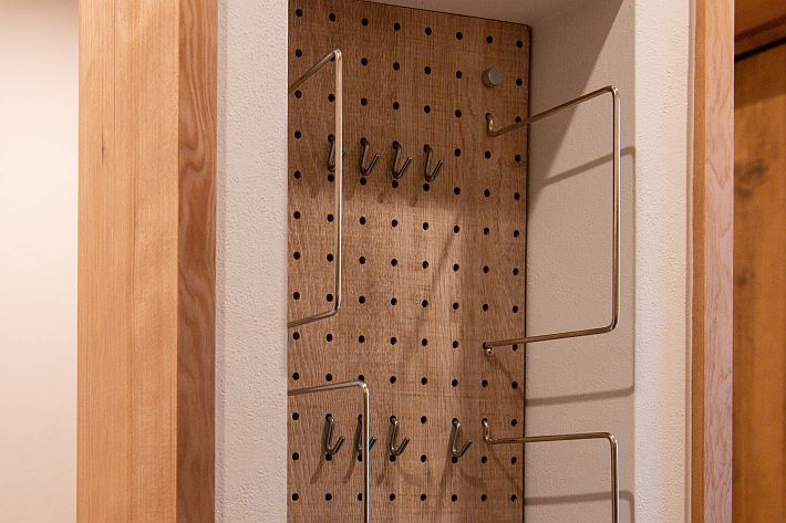 玄関ホールのわずかなスペースに設置した有孔ボード。鍵を収納したり、マスクを掛けたり、なにかと便利です。