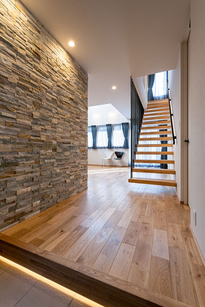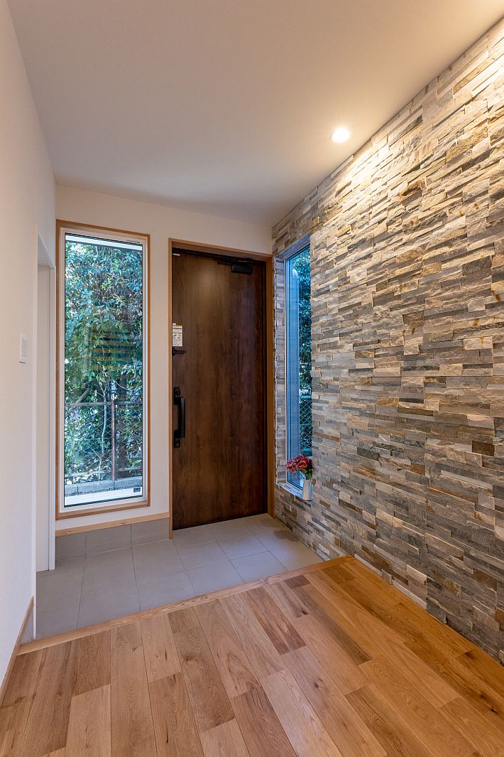 S様邸の玄関ホール。右側の壁には天然石材のバンピーウォールを施工しています。バンピーウォールの中のFIX窓をご覧ください。窓のフチの中まで石を張り込んで、石の中にガラスだけが嵌め込んであるように見せています。