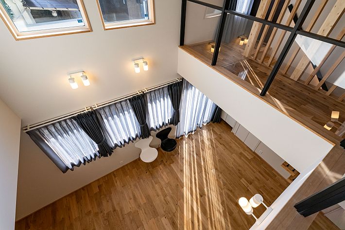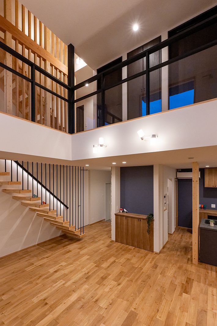 S様邸の大きな吹き抜けスペース。この吹き抜けを実現するために、S様邸の構造材には一部LVL材を採用しています。2階ホールの手すりは木製ですが、吊り階段を支える鉄製ポールと同じ色になるように塗装しています。手すりの下部分にはポリカーボネートの透明パネルを入れています。