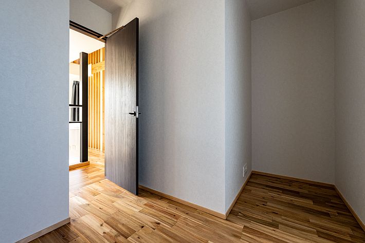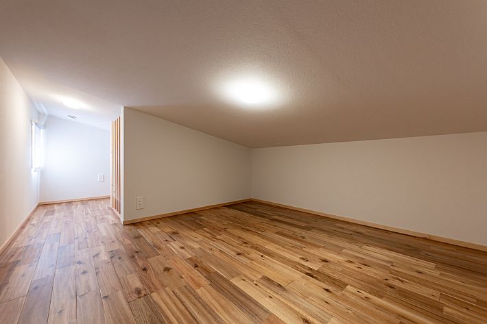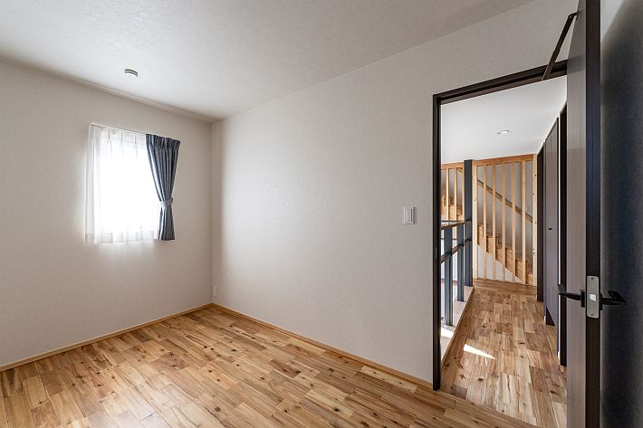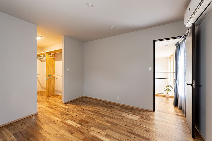 2階主寝室。2階の床にはアカシアの無垢材を使っています。