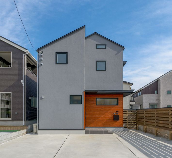 落ち着きのあるグレーの塗り壁に明るいブラウンの板張りを組み合わせて、温かい印象の外観に。