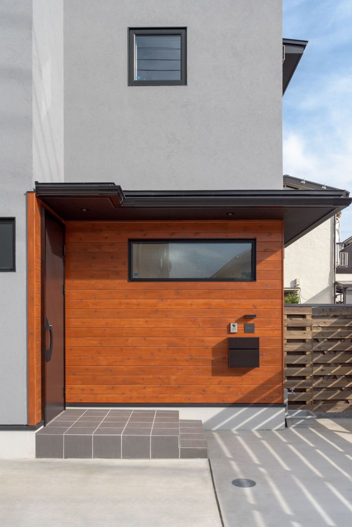 玄関周りはウエスタンレッドシダーの板張りに、明るいブラウンのオスモカラーを塗装して仕上げています。