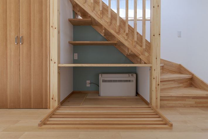 リビングのスケルトン階段の下には床下エアコンを収納。真冬でもこれ一台で1階はポカポカです。