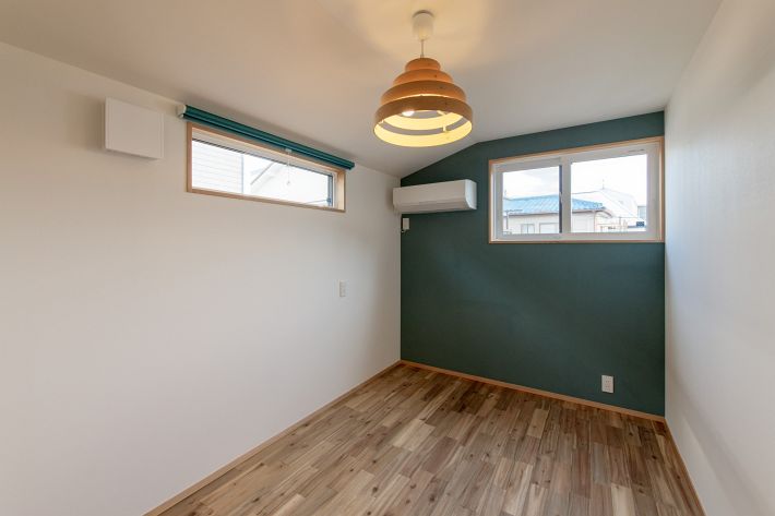 2階のご主人の寝室。ブルーのアクセントクロスが空間にメリハリをつけ部屋を広く見せてくれます。