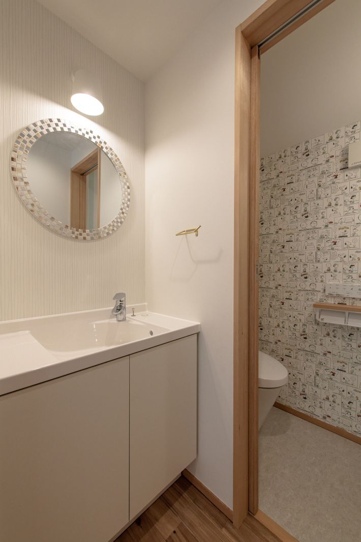 清潔感のある2階の洗面スペースと、スヌーピーの壁紙がかわいらしいトイレ。