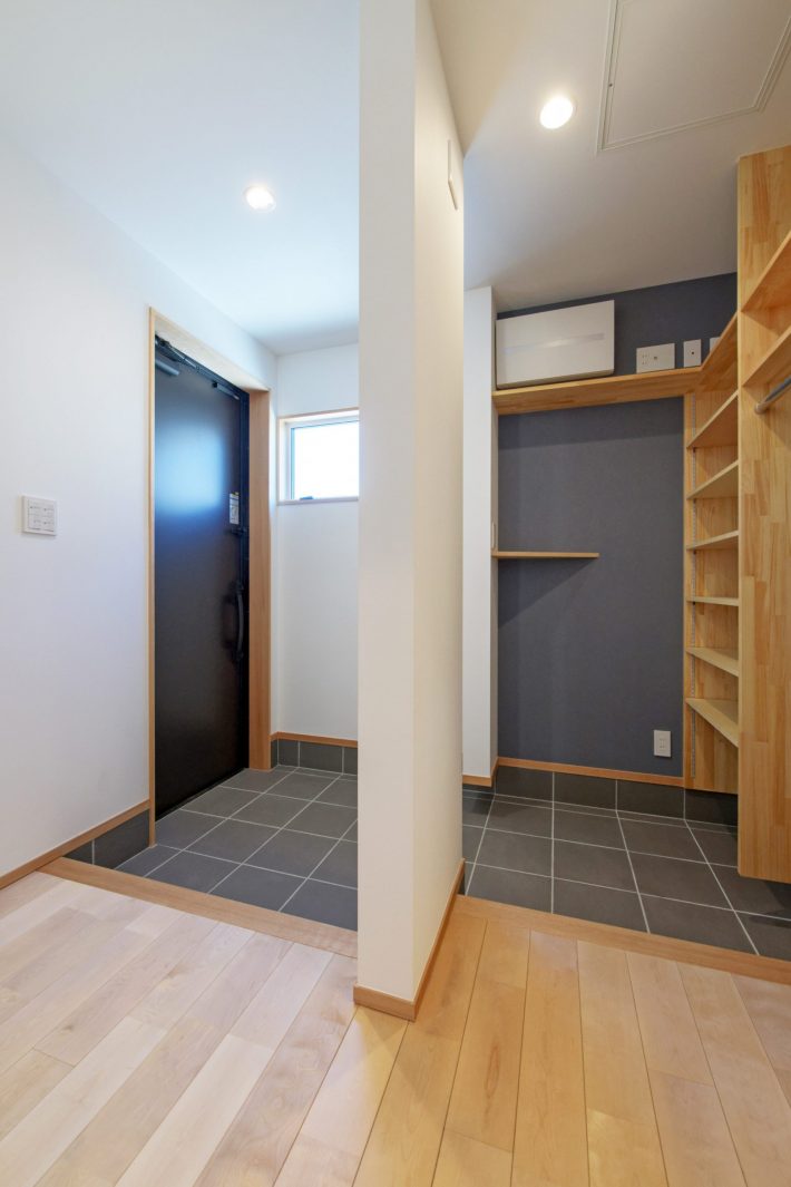 広くて明るい玄関スペース。右側のスペースは機能性とデザイン性を考慮した土間収納です。
