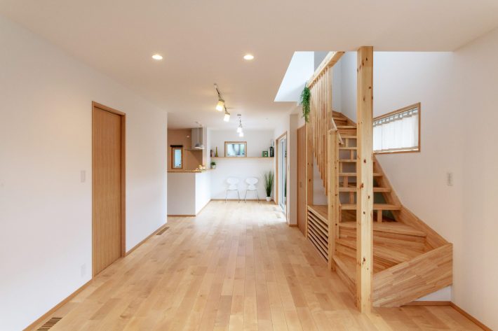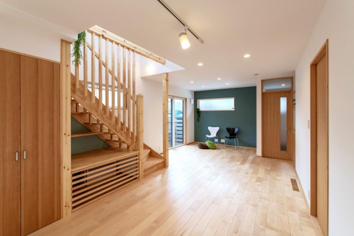 LDKの中央から見た西側リビング。床は無垢のバーチ材で、白い壁紙は塗り壁のような手触りが特徴のエコフリースを使っています。