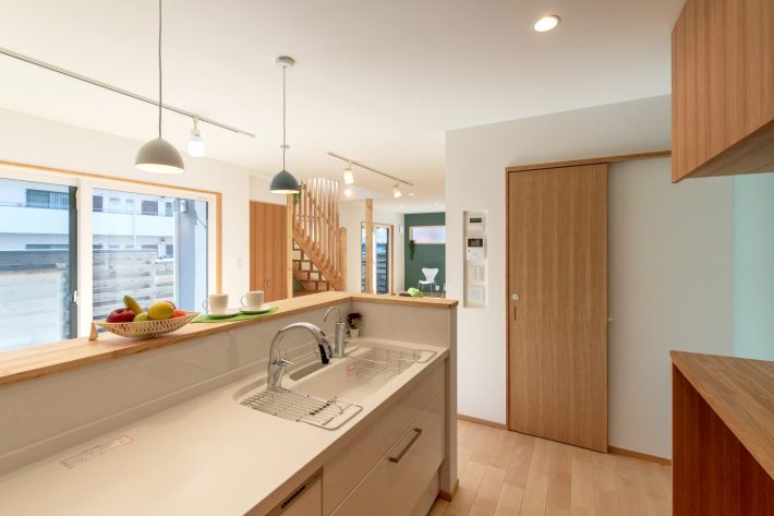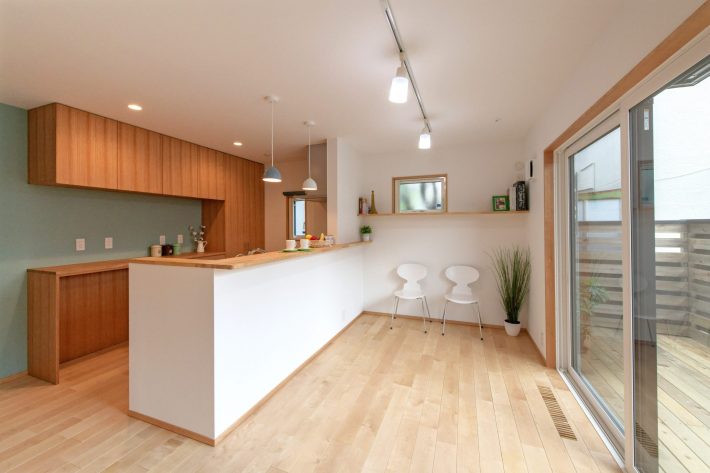LDKの東側に位置する、開放的なダイニングスペースとキッチン。大きな窓の外には、室内の延長のような一体感のあるウッドデッキを設けています。