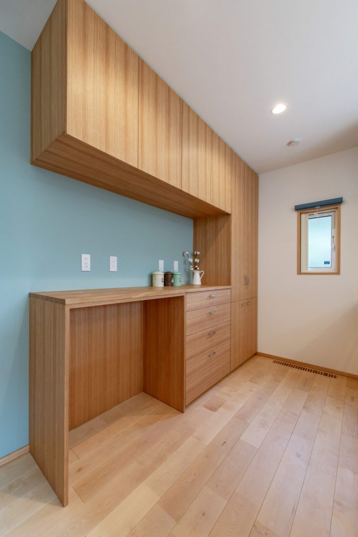 家具職人が造作したキッチンの背面カウンター。柾目(まさめ)のタモ材の突板(つきいた)を使って作っています。壁紙の色との相性が素晴らしい出来上がりとなりました。