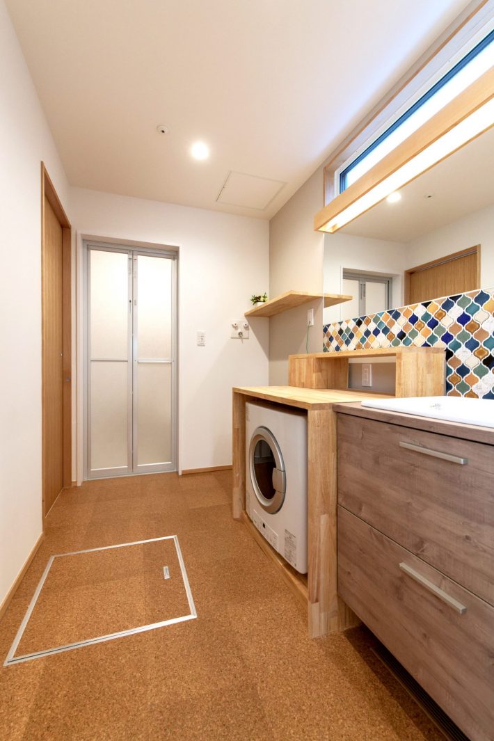 ランドリールーム。真ん中にあるガス衣類乾燥機の乾太くんをカバーしている木枠は、収納スペースとしても使える造作家具です。簡単に分解できるので、乾太くんのメンテナンス時にも邪魔になりません。