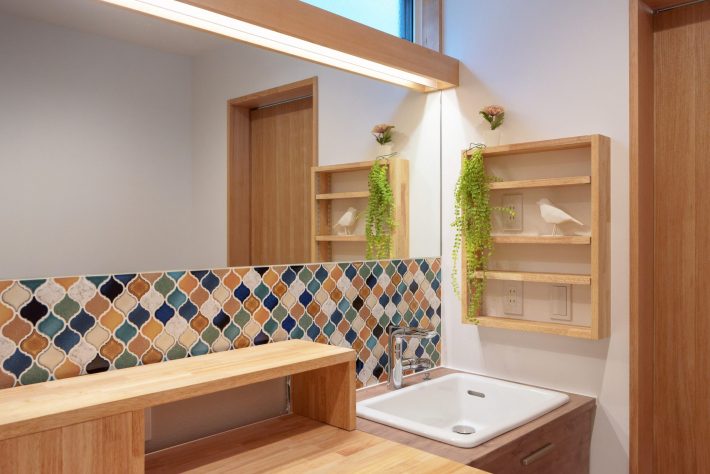 レトロなタイルがおしゃれな洗面台。小さな棚も造り付けました。