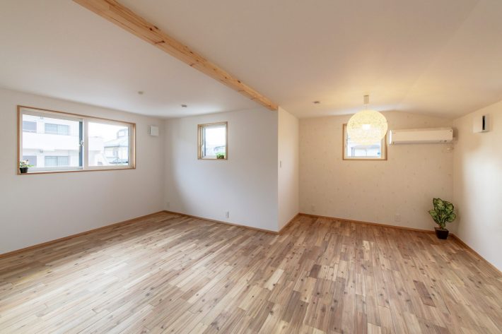 2階の子ども部屋。現在は凸型の大空間ですが、将来は3つの部屋に分けることができるようになっています。床材は2階の全室、無垢のアカシアです。