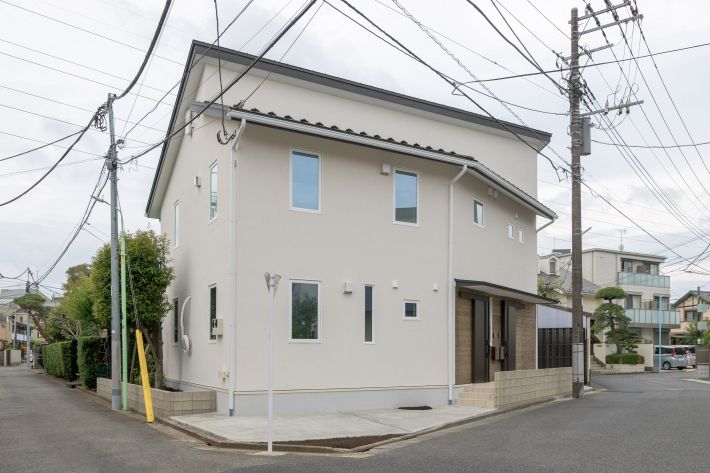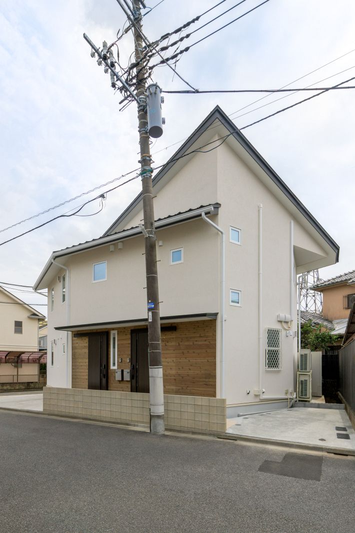1階が親世帯、2階が子世帯の完全分離型二世帯住宅。ベージュの塗り壁と横張りにしたレッドシダーの組み合わせが、洋風でかわいらしい印象の外観です