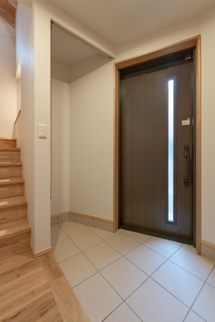 完全分離型の二世帯住宅なので玄関は2つ。ドアはスペースが広々と使えて楽に出入りできる引き戸タイプを採用しています