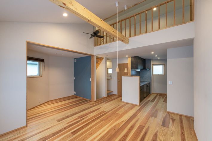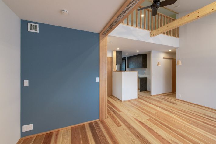 2階:子世帯/LDK(1)。キッチン上はロフト、床は無垢の杉。左側のブルーグレーのアクセントウォールがあるスペースは、リビングと仕切ることができる書斎です