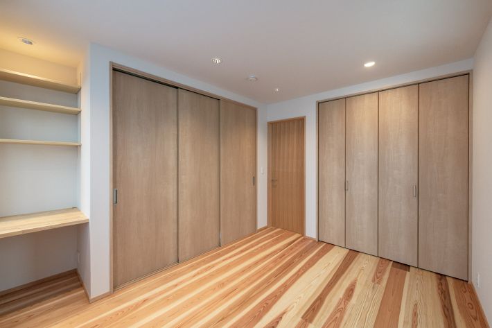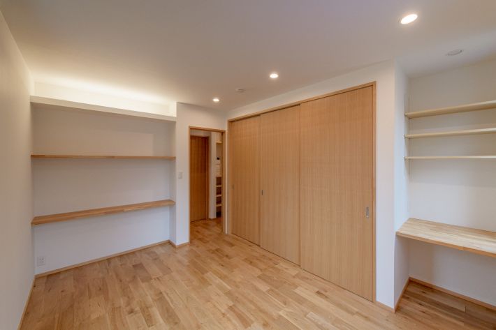 子世帯/主寝室。たっぷりのクローゼット収納と造作棚を設け、スッキリとした快適な空間を目指しました
