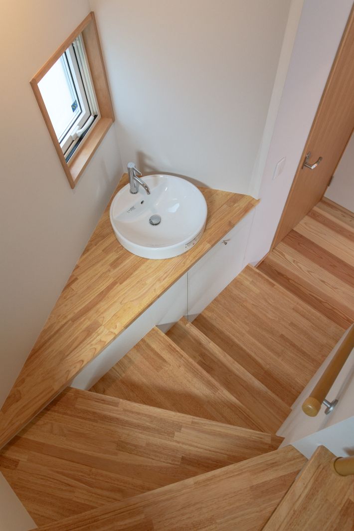 子世帯/トイレ横の手洗いスペース。ロフトへ上がる階段途中の三角形のデッドスペースを有効活用して造作しました