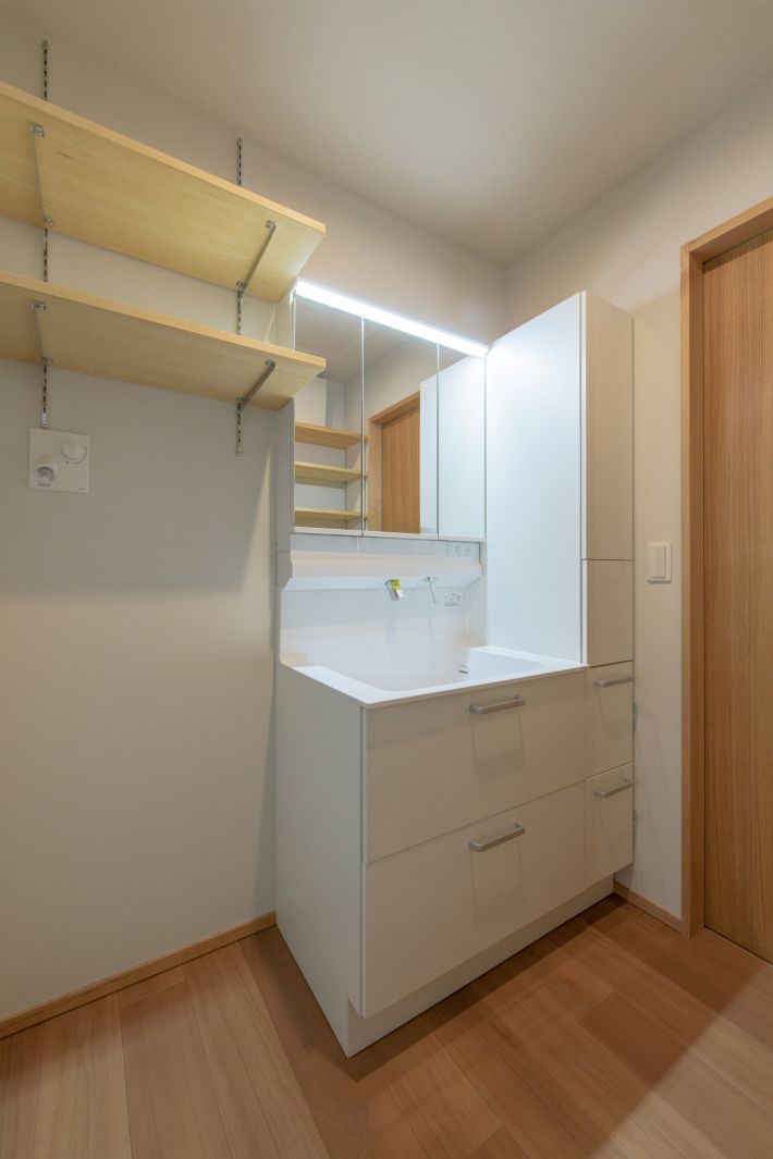 子世帯/洗面室。写真にはすべてが写っていませんが、空いている壁には可動式の収納棚を造り付けています