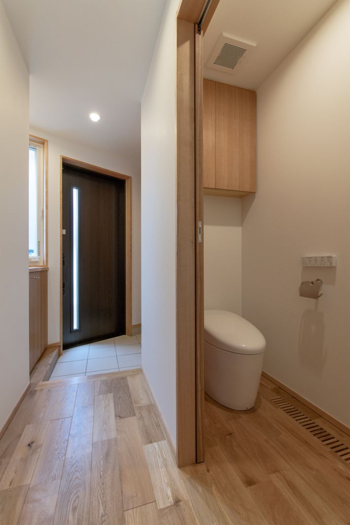 1階:親世帯/玄関とトイレスペース。1階のフロアはすべてオークの無垢の床材を採用しています