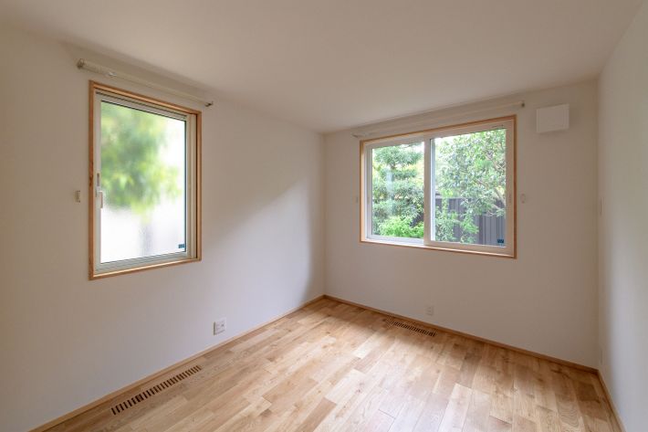 子世帯/子供部屋。将来2つに区切ることができます。奥の壁に造り付けた本棚は、裏側の部屋のクローゼットの奥行きを少しだけ縮めてスペースを確保しました