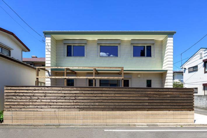 T様邸の外観です。パッシブハウス認定を取得するには、外壁材や屋根材に日射反射率の高い色を選ぶ必要があるため、黒やグレーではなく、屋根は反射率60%のウグイス色、外壁は反射率67%のアイボリーにしています。2階の窓まわりが水色がかって見えるのは、1階の庇に使用しているウグイス色が反射しているから。結果的に、とてもきれいな色合いとなりました。