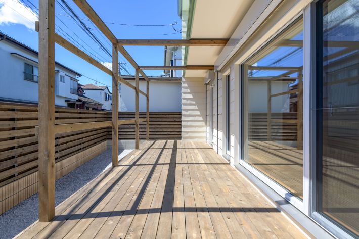 建物の南側に設置したパーゴラ付きのウッドデッキ。ウッドデッキに面した大型の窓は「スマートウィン(佐藤の窓)」という超高断熱仕様の国産木製サッシです。