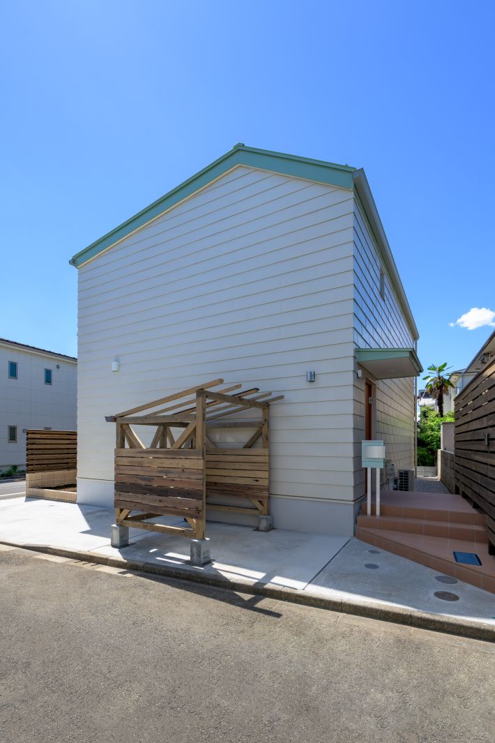 東側外観。壁面に窓がありませんが、パッシブハウスの場合、直射日光の影響を受けやすい東西にはほとんど窓を付けません。(パッシブハウスは人の体温だけで室温が上がるほどの超高気密・超高断熱住宅なので、日射遮蔽の難しい東西の壁面に窓を付けてしまうと、夏場は太陽の熱で室温が異常に上がってしまうのです)