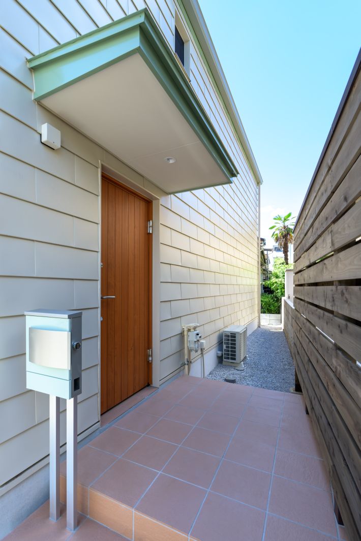 北側に設けた玄関エントランス。外壁材のガルバリウム鋼板は一文字葺きという、普通の横葺きより少し手間のかかる手法で仕上げています。