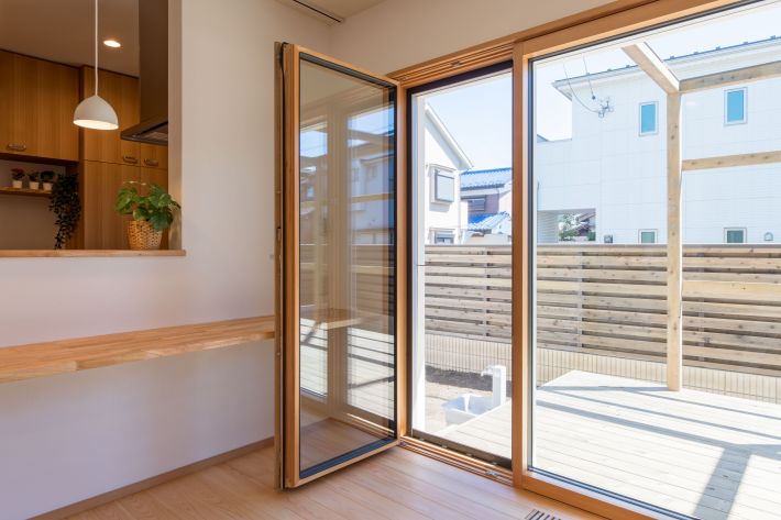 リビングの大きな窓と水平につながるウッドデッキ。ドアのように窓を開けて出入りします。