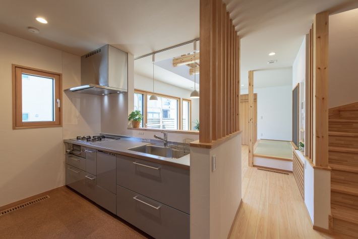 南面の正方形の窓から日差しが入る、明るいキッチンスペース。化粧格子でスペースをゆるやかに仕切っているので、圧迫感を感じさせません。