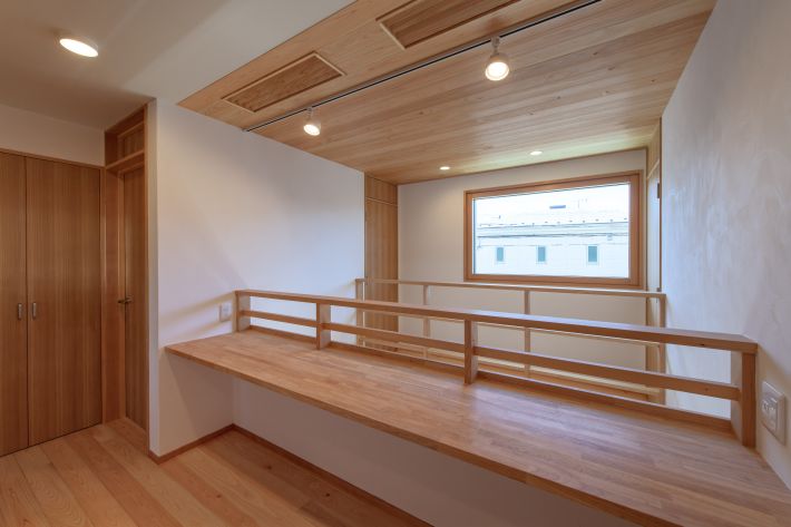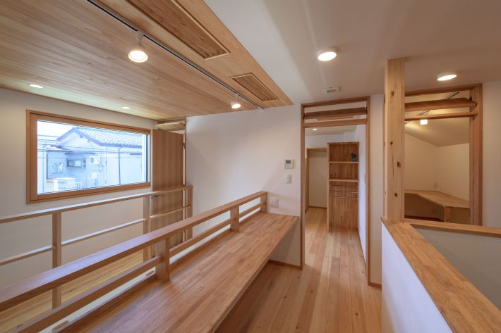 吹き抜けに面した2階ホール。手前は造作のスタディカウンター、天井はヒノキの無垢材。正面の窓際に通路を作って、右側の主寝室と左側の子ども部屋を結び、吹き抜けのまわりをぐるっと回遊できるようにしています。