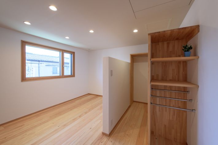 主寝室には、上部を開放した間仕切り壁を設置して、オープンな形状のウォークインクローゼットを造作しました。右側の収納棚の下段にはズボン掛けのパイプを入れています。