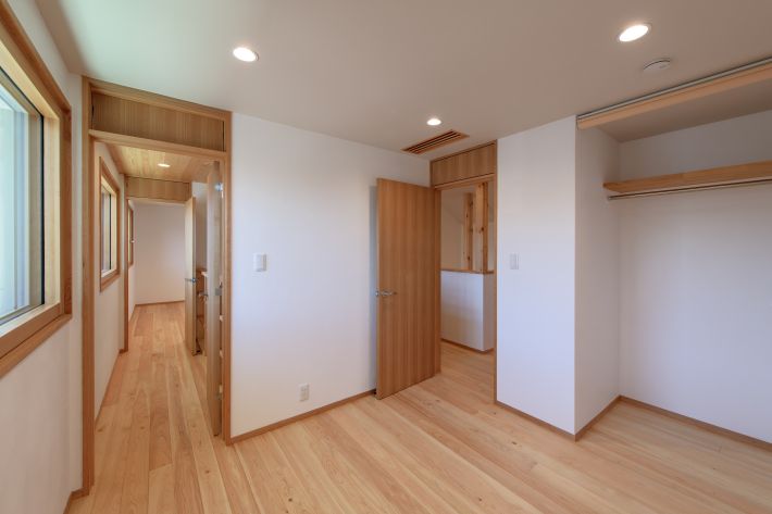 主寝室からホール方向を撮影。主寝室→2階ホール→子ども部屋→2階ホール→主寝室という具合に、ホールを中心とした回遊動線となっています。