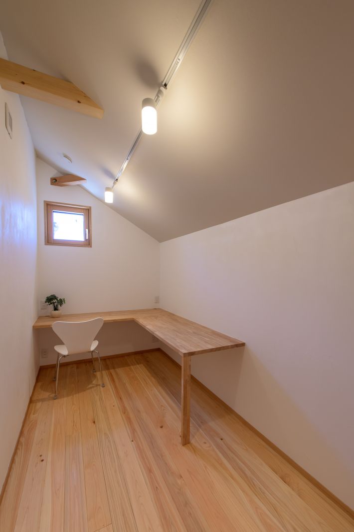 2階北側の書斎。造作した一本足デザインのL字型テーブルは、壁の中に天板を埋め込むかたちで据え付けているので、見た目とはうらはらにかなり頑丈です。