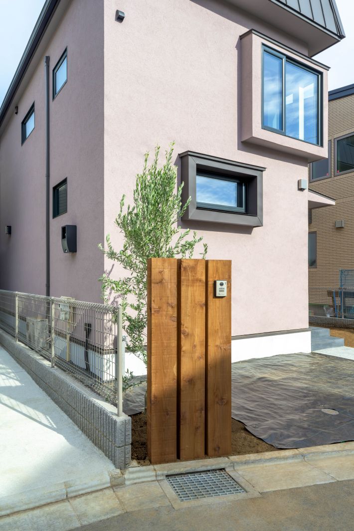 とんがり屋根のかわいらしい外観。外壁の色はピンクのように見えますが、実際は薄いパープルです。急勾配の屋根にドーマー窓を設置したいというご要望でした
