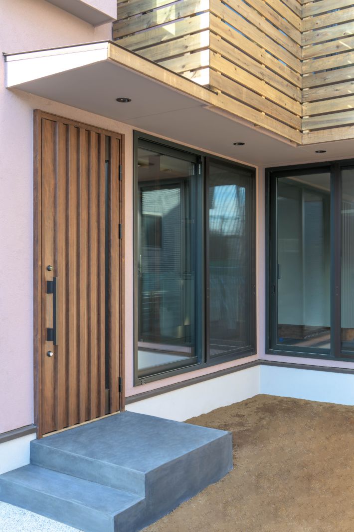 玄関エントランス。ポーチは墨モルタルで仕上げています。直角に組み合わせた引き違い窓の向こう側にはL字型の土間リビングがあります