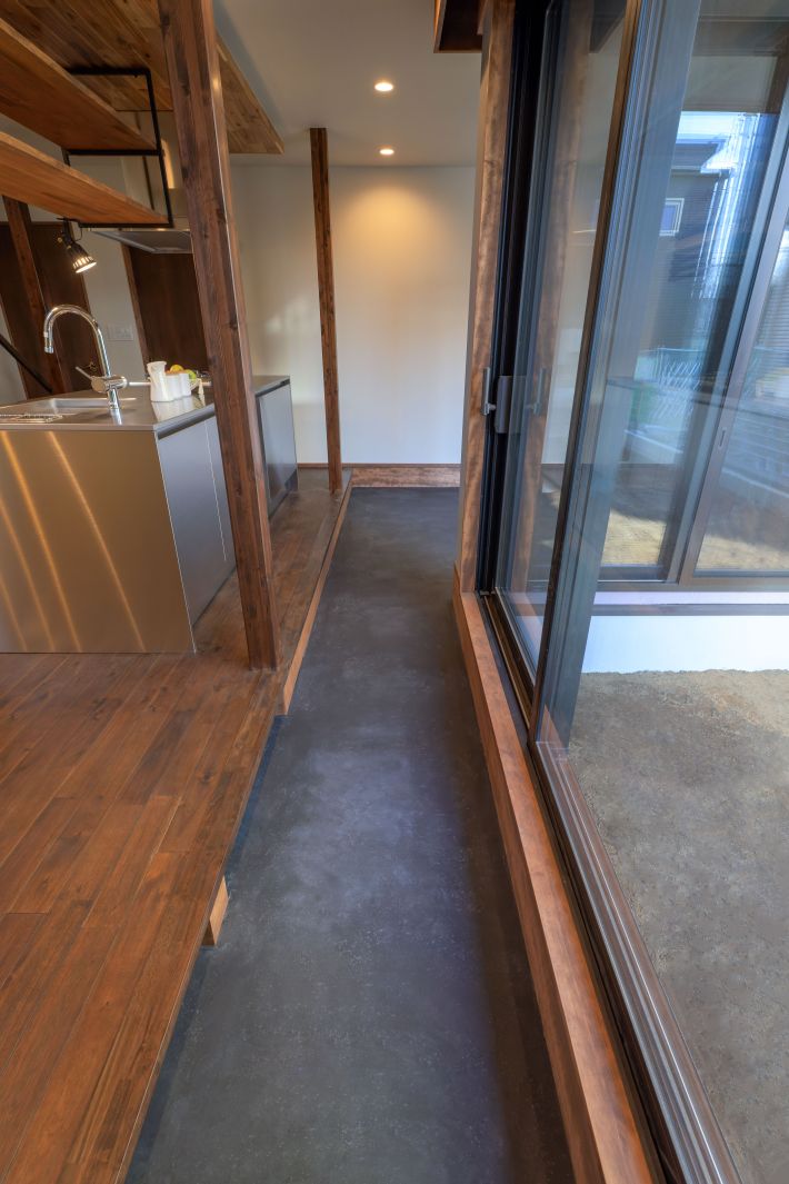 土間リビング。玄関ポーチと同じ墨モルタルで塗装しています