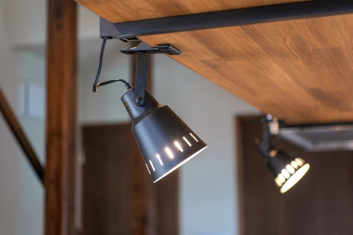 キッチンの上の吊り下げラックのスポットライトは、黒い鉄枠の中に配線を通してスッキリ見えるように工夫しています