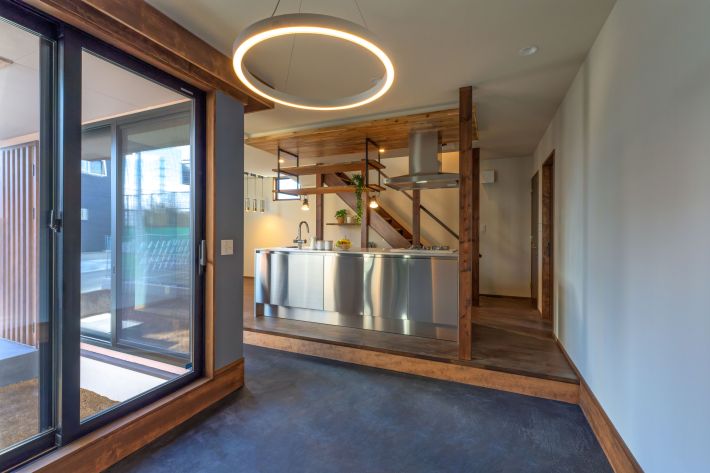 土間リビングから見たダイニングスペース。印象的な円形のシャンデリアはM様からの指定品です