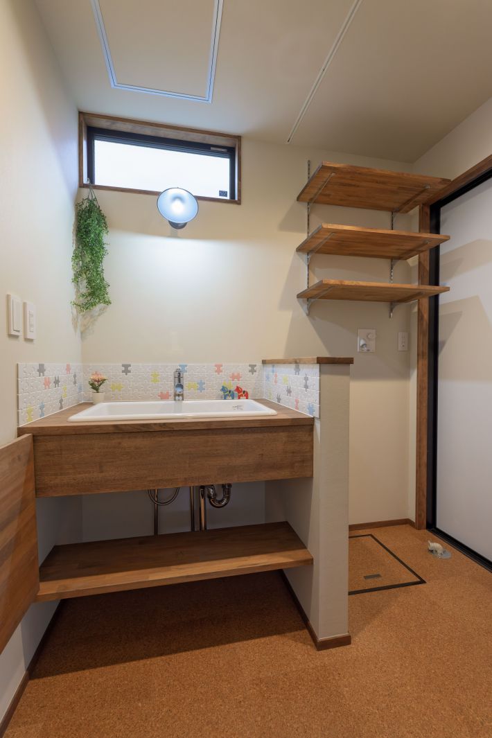 ジグソーパズル柄のタイルを貼った1階の造作洗面台。鏡はM様がDIYで取り付ける予定です