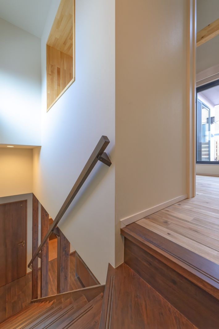 ワークスペース。ご夫婦ともに設計のお仕事をされているので、大きな設計図面を広げられるサイズに造作しました。仕事をしながら顔を上げると、階段越しに外の風景が眺められるよう、窓を配置しています
