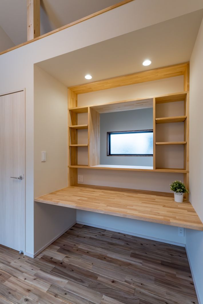 2階に上がってすぐのホールは吹き抜けになっていて、上の空間にはロフトを作っています。左側は造作のワークスペース