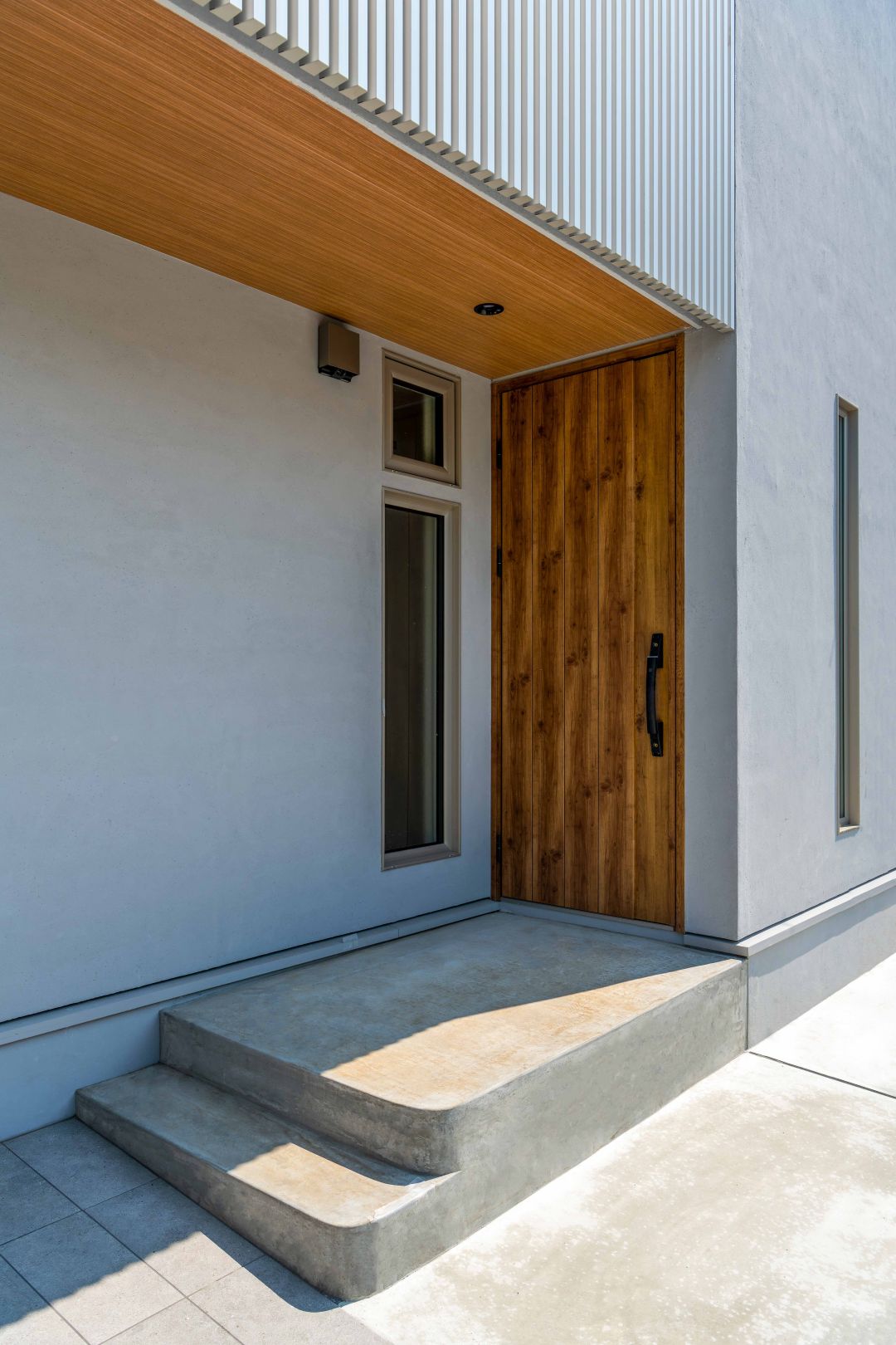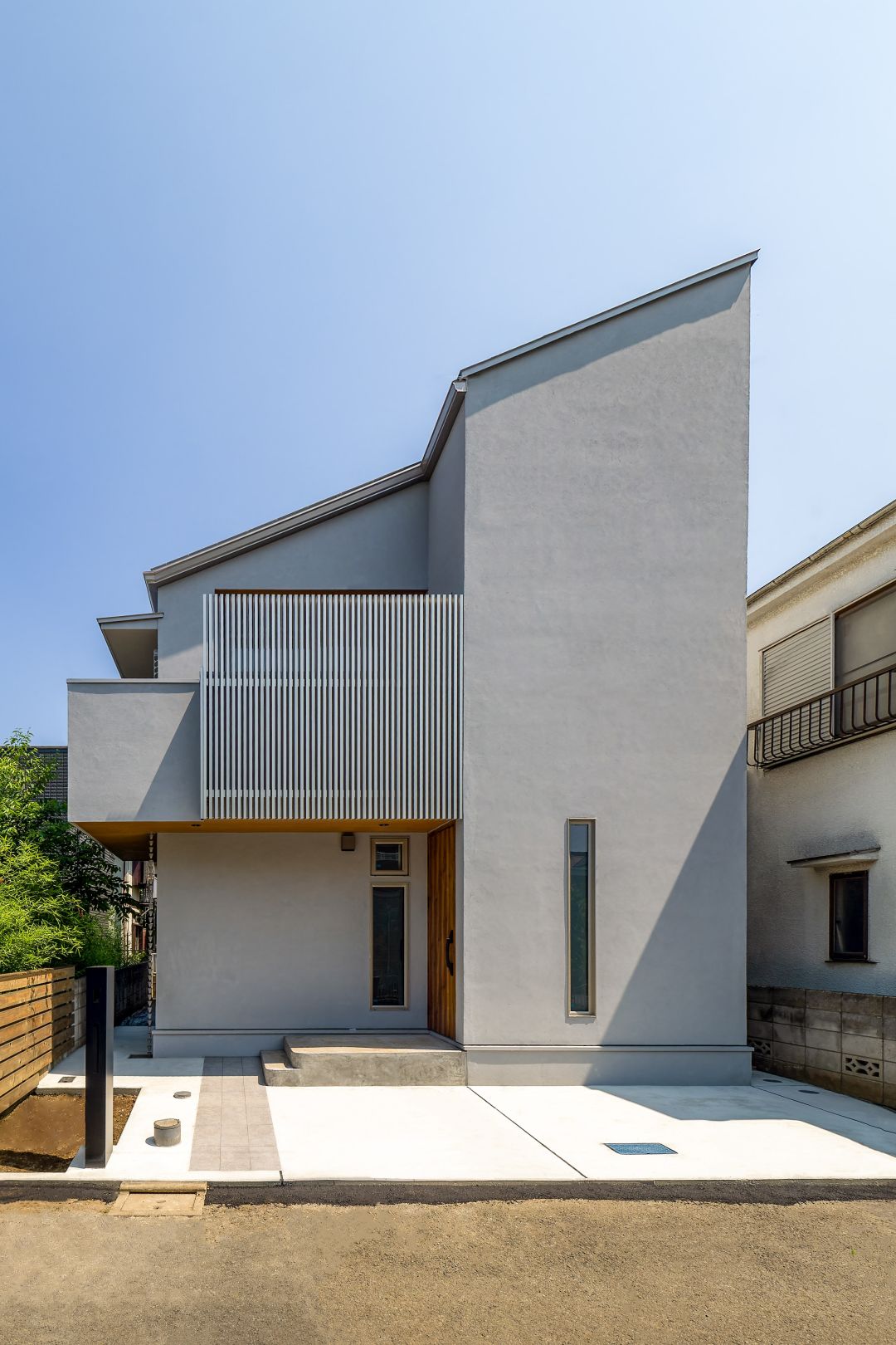 グレーの塗り壁が上品な印象の外観。正面のおしゃれな縦格子は、道路からの視線を違和感なく遮る役割も果たしています。2階リビングの中が外から見えないように、格子の長さを調整して特注で作りました。