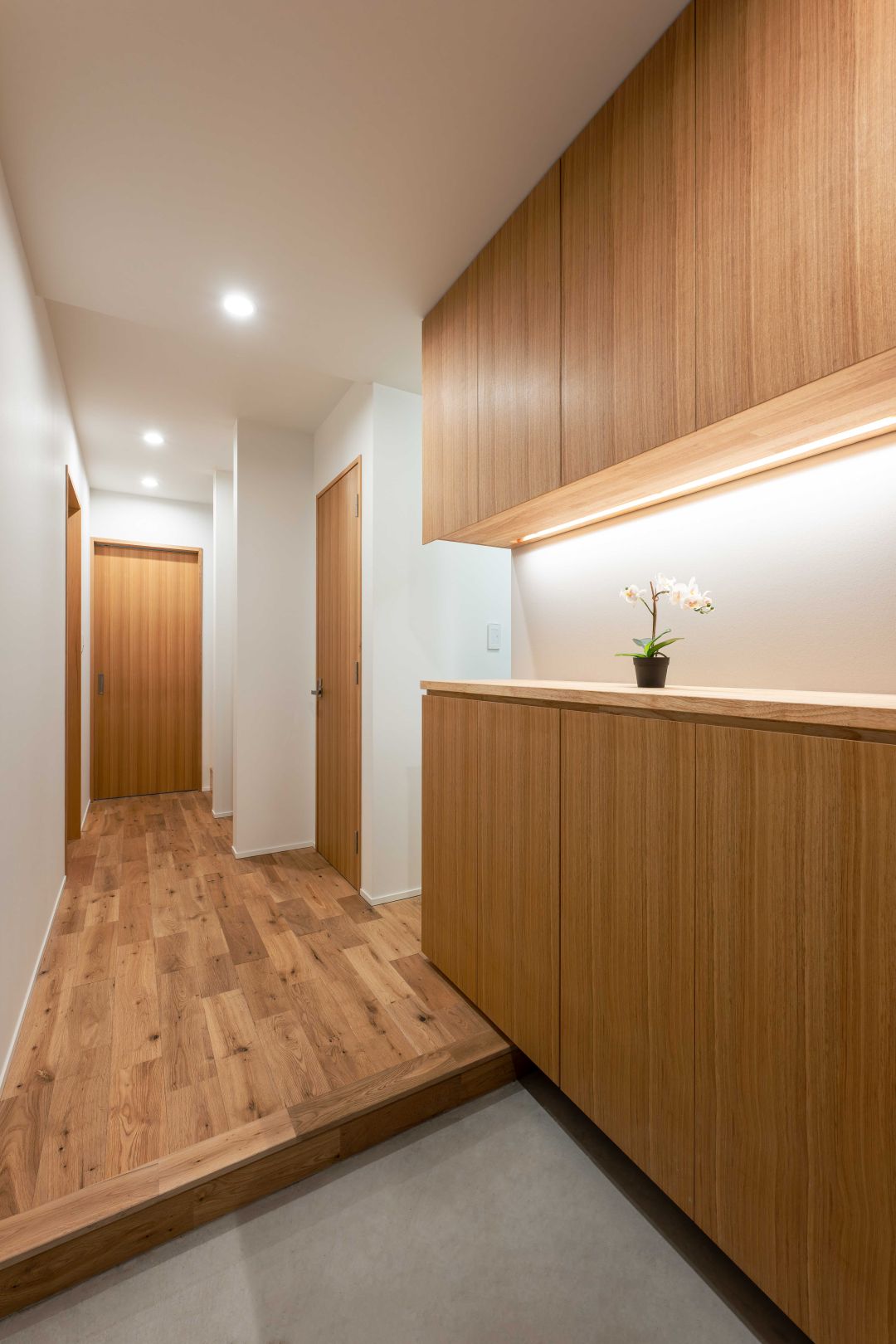 造作した玄関収納には間接照明を取り入れて明るい空間に。