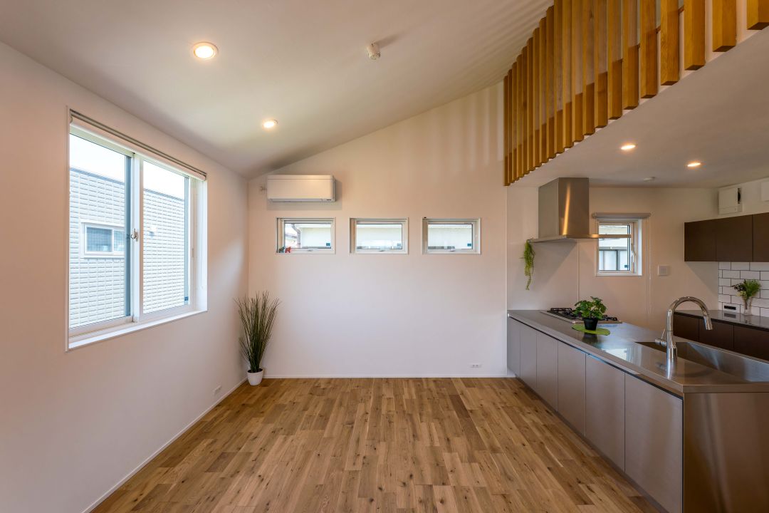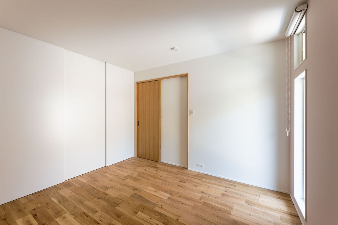 1階洋室全景。窓の位置やサイズを工夫して、プライバシーを守りつつ採光を確保しています。