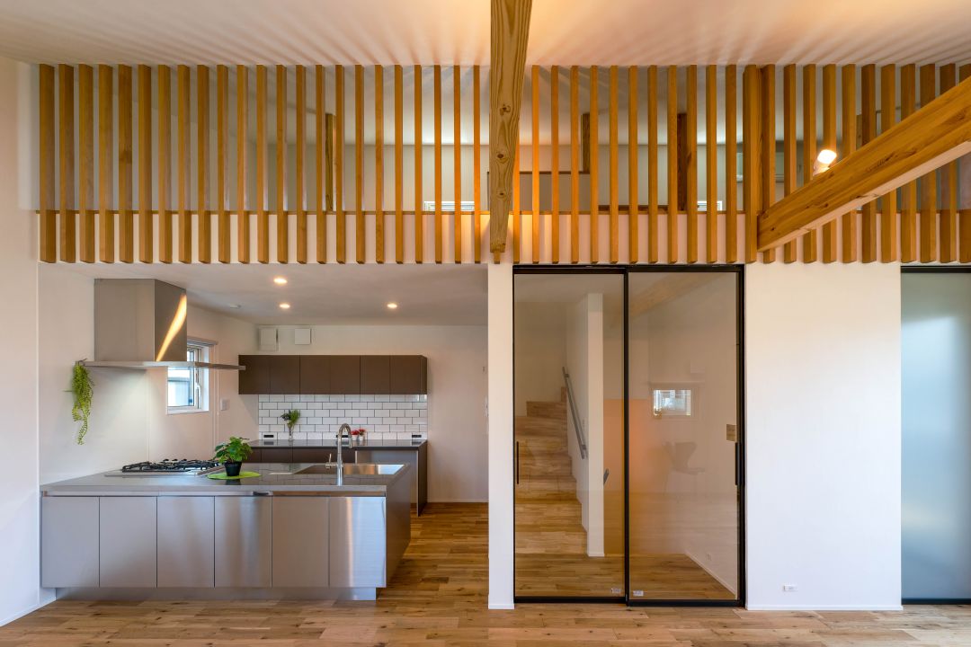 キッチン上の木製格子の向こうはロフトスペース。ロフトに設置した小さな窓からの光が、格子を通してリビングに注ぎ込み、明るい空間が実現しました。キッチン背面の壁に貼った白いサブウェイタイルも光に反射して輝いています。