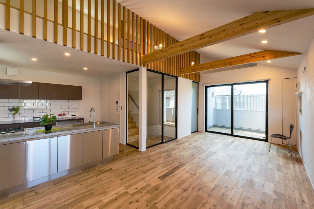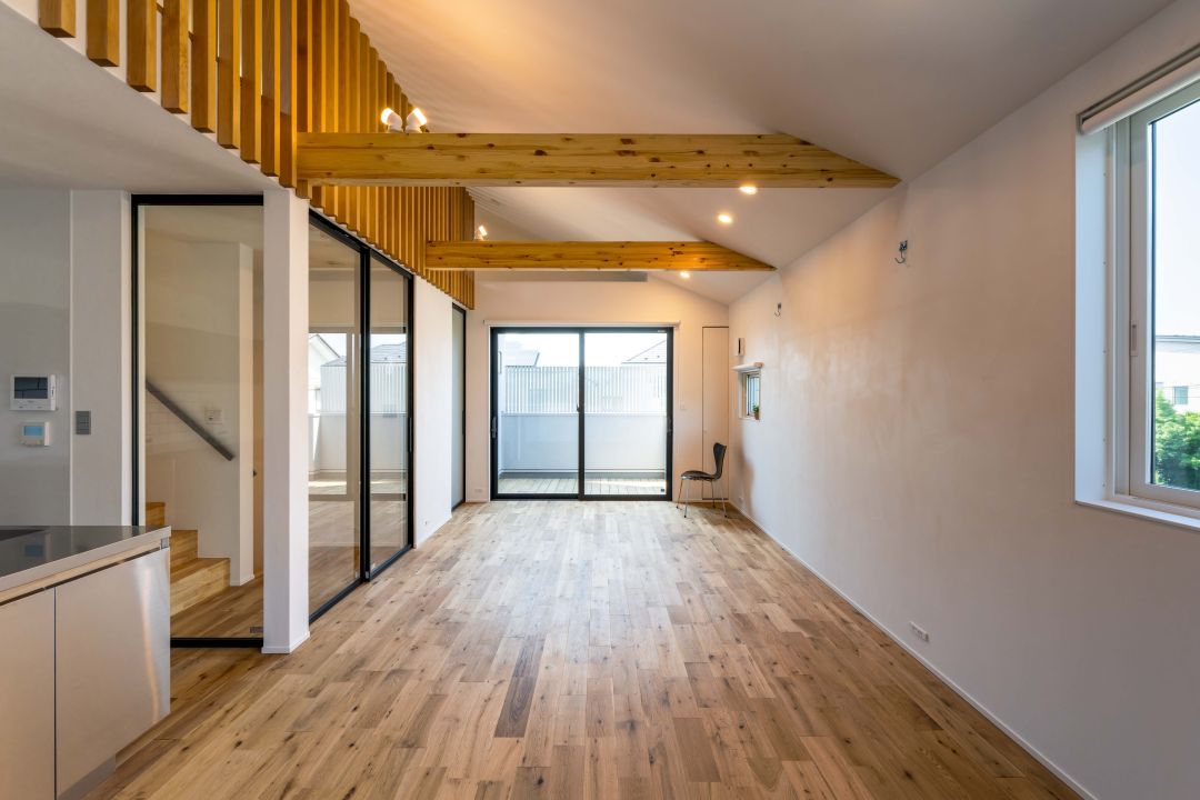 開放的な2階LDK。天井の化粧梁と縦格子が柔らかな陰影を生み、立体感を演出しています。床は1階も2階もオークの無垢材、壁は1階エコフリース、2階は珪藻土塗り。自然素材の良さが際立つ心地良い空間です。